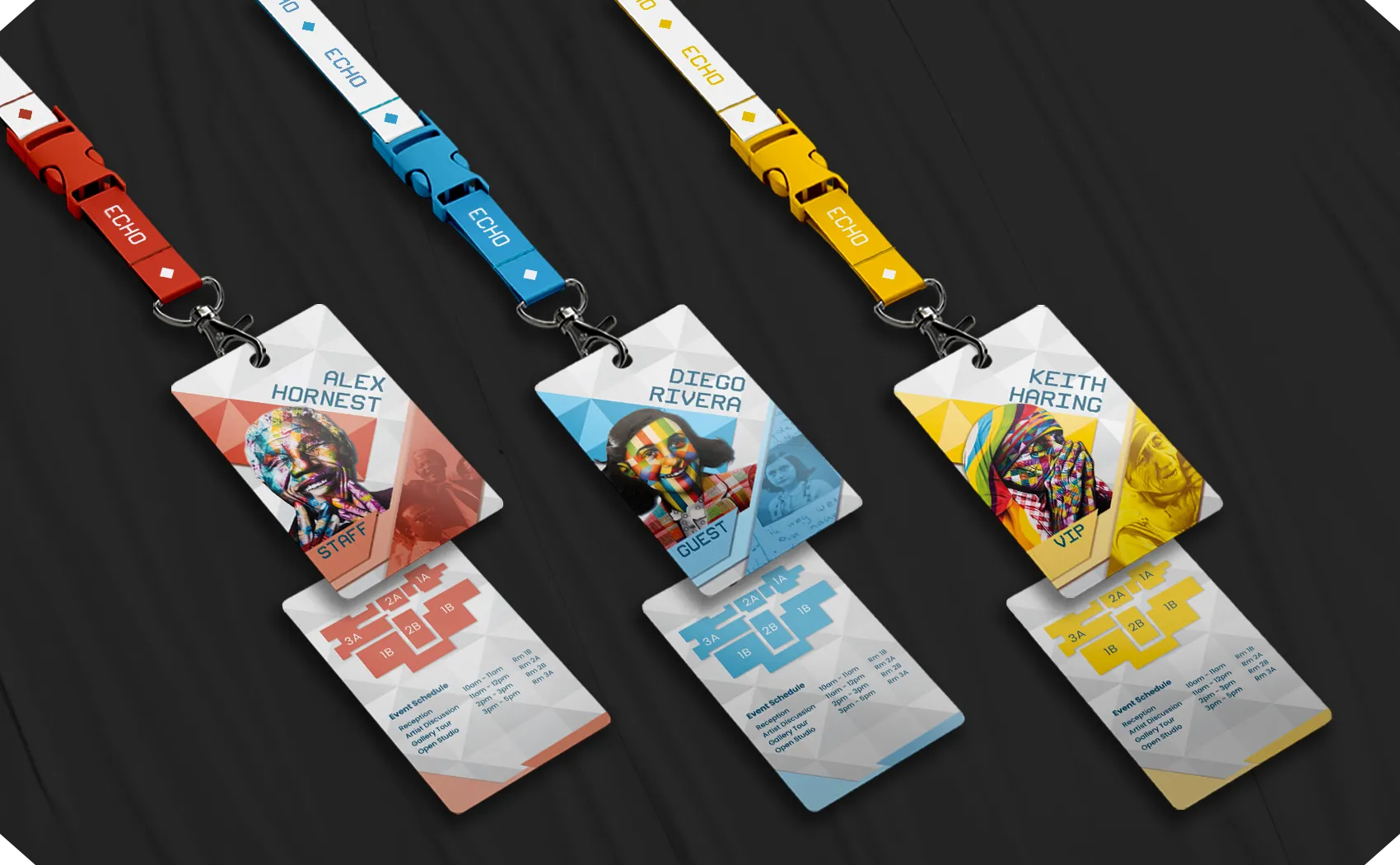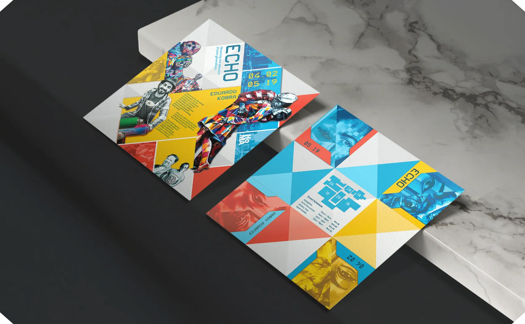 Promotional materials for Eduardo Kobra's ECHO proposed exhibition: blending vibrant geometric shapes with historical figures. Features invitations, event badges, and merchandise, with a focus on engaging diverse audiences, particularly younger generations, in the fusion of art and history.