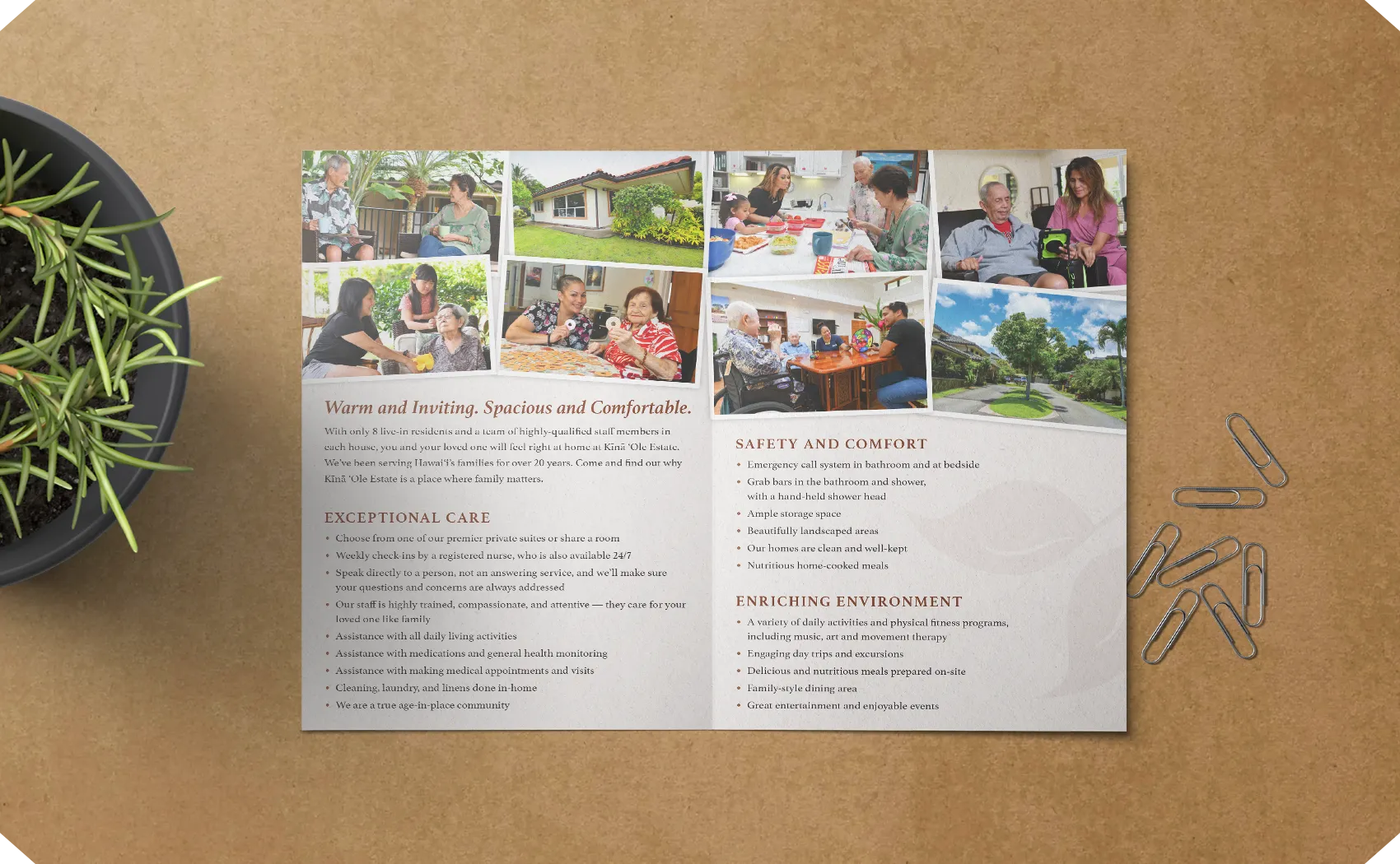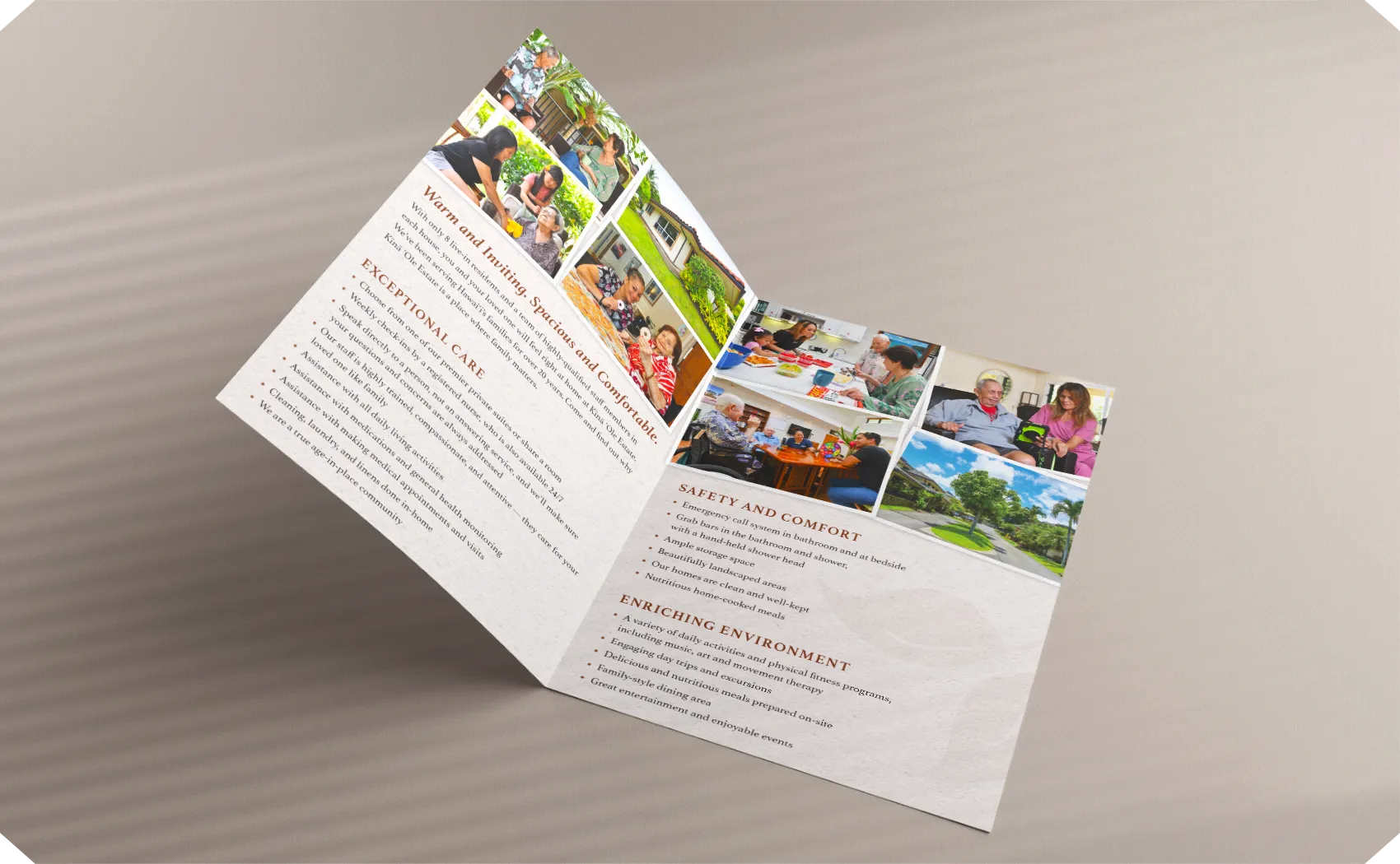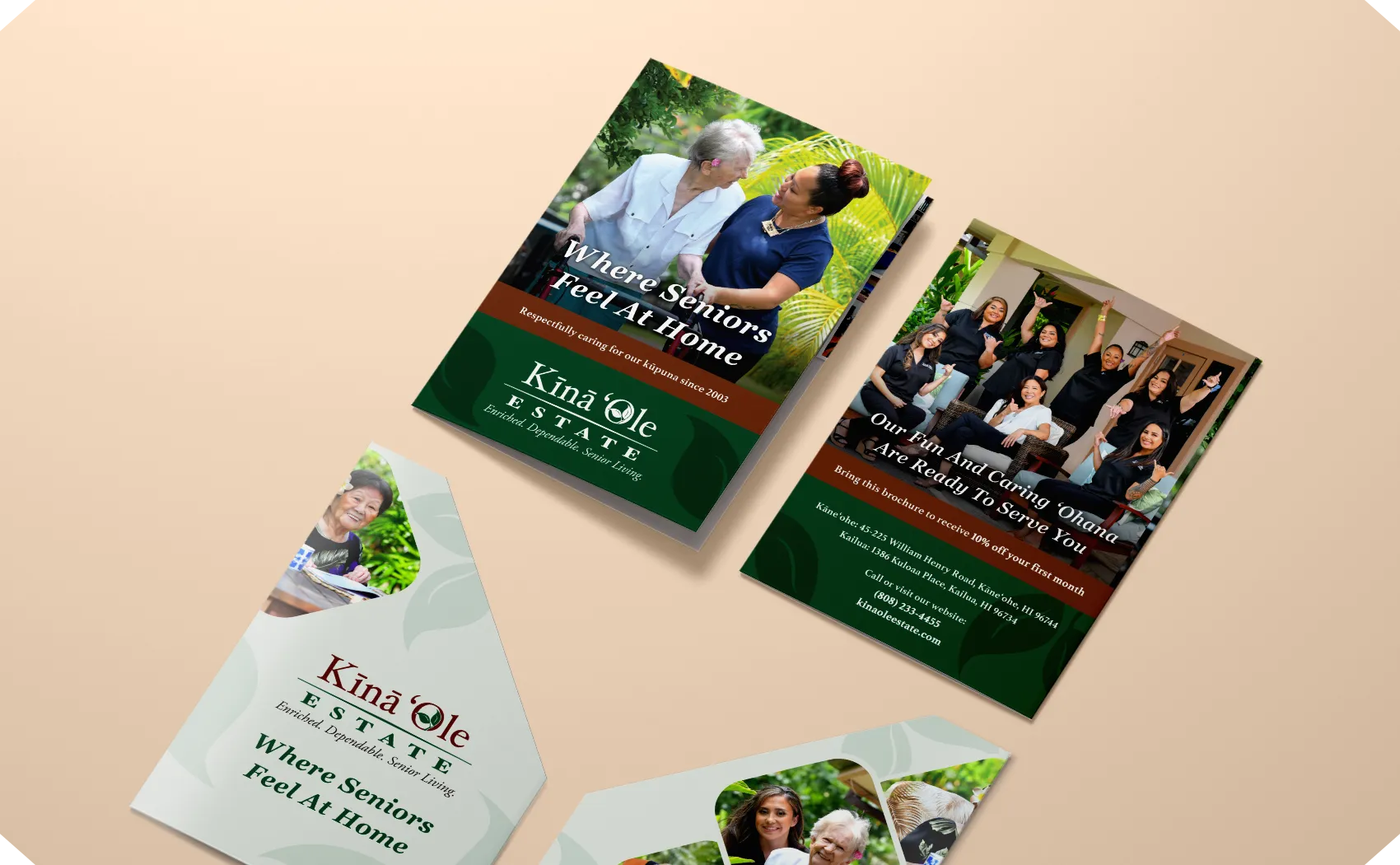 Kīnā ‘Ole Estate aimed to create an eye-catching and memorable brochure, with a unique form that reflects their brand identity. The brochure captures the welcoming nature and high quality care offered by the client. Taking on a distinct form, the main brochure comes wrapped in an outer slip sleeve.